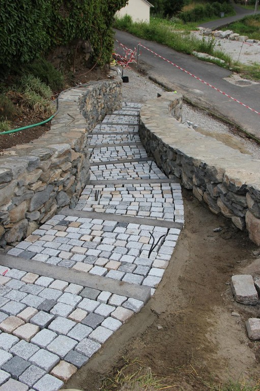 Création d'allées ou de voie d'accès par un pavage, un dallage, un escalier ou le maintien d'un dénivelé par un muret.