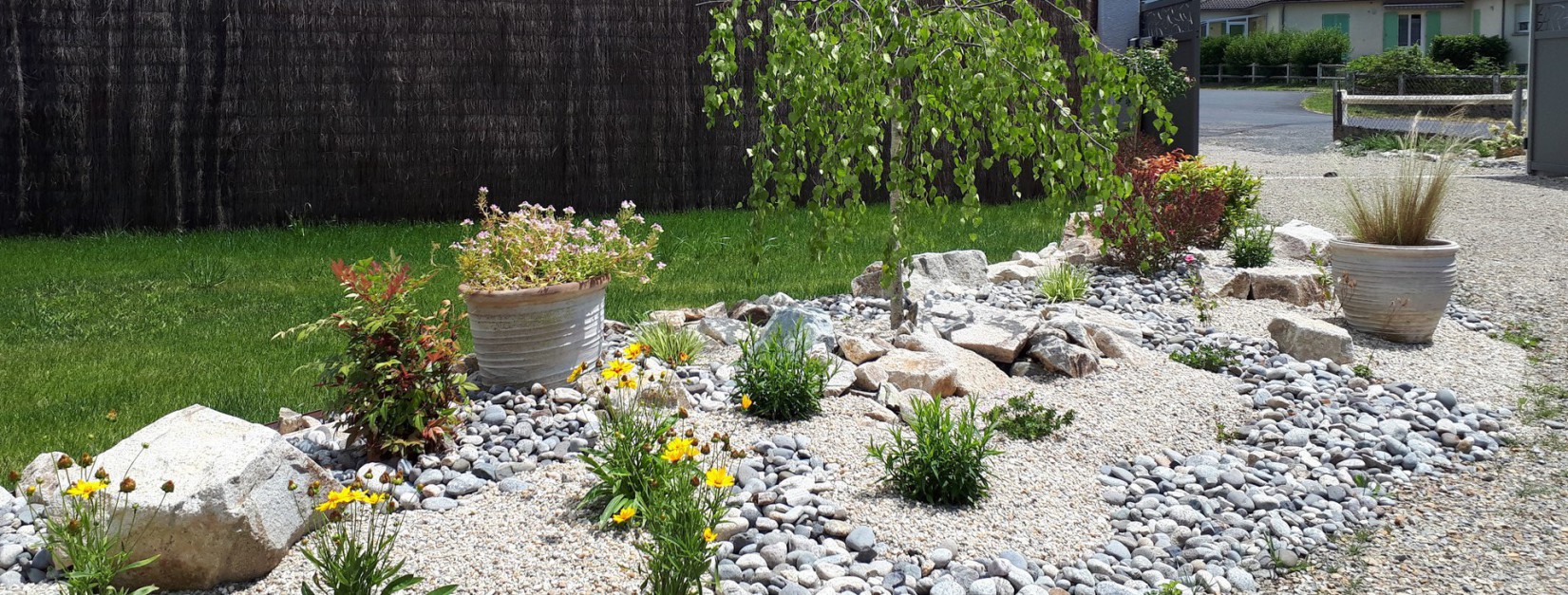 Le paillage minéral composé de galets de rivière et de paillettes d'ardoise apporte à l'aménagement une touche de modernité et d'élégance.